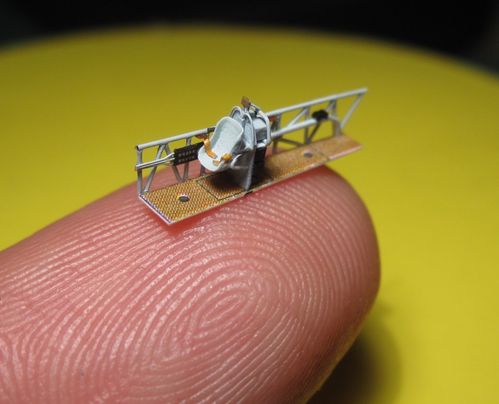 Ebenfalls im beinah subatomaren Bereich arbeitet Mister Mikro beim Modell eines der Aufklärungsflugzeuge, welche die Prinz Eugen mit sich führte. Die Tragflächen des etwa drei Zentimeter kleinen Fliegerchens haben einzeln aufgehängte Klappen, und die Cockpiteinrichtung ist die kleinste, die je gebaut wurde. Fusspedal, Sicherheitsgurte, Kopfstützen – selbst das komplette Armaturenbrett hat Grüninger kreiert, letzteres auf der Fläche eines Stecknadelkopfs, aus 0.1-mm-Draht und mikroskopisch kleinen Tröpfchen Weissleim.