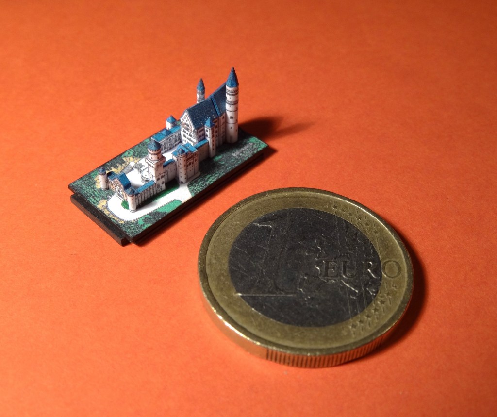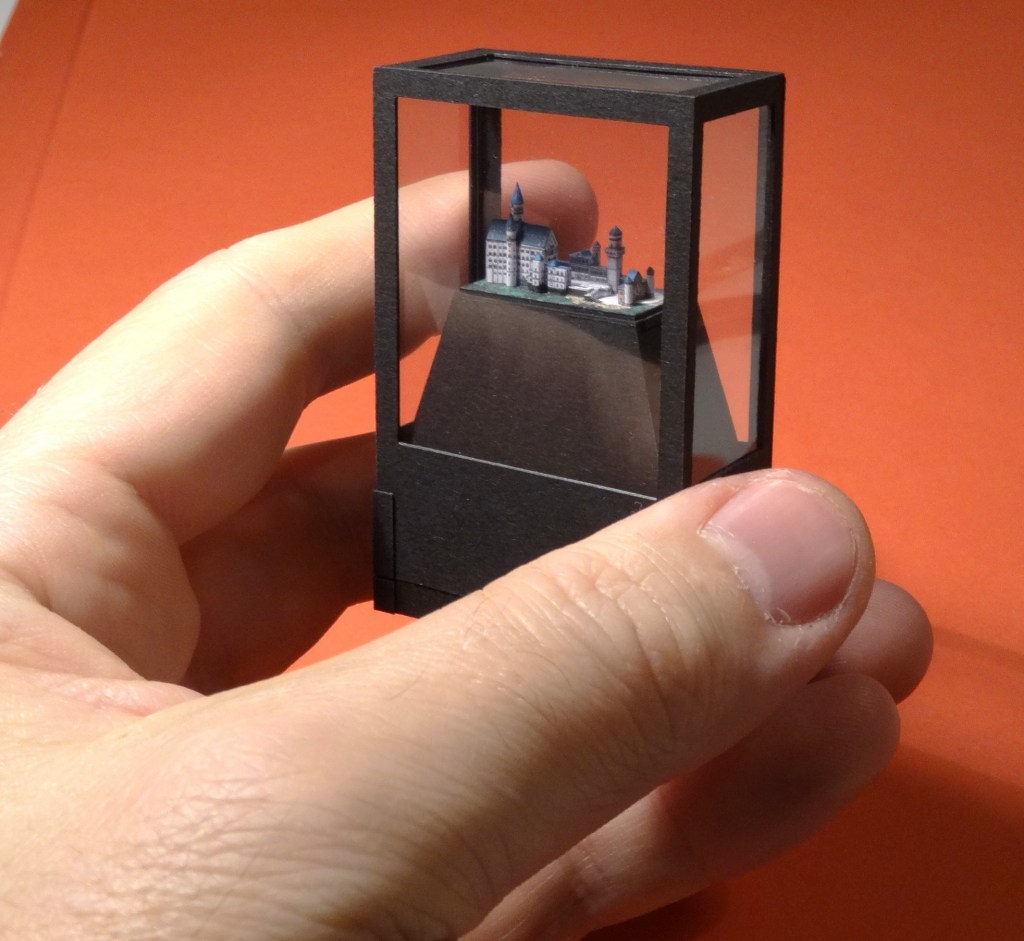 Tatsächlich hat sich Grüninger in all den Jahren als Modellbaubesessener ein fast schon alchemistisches Wissen über die Materialeigenschaften von Papier angeeignet. Wo seine Kollegen etwa ein gewöhnliches Falzbeil verwenden, macht Mister Mikro mit dem Japanmesser auf der Rückseite zwei kaum voneinander entfernte feine Schnitte und kratzt dann mit einer Präzisionspinzette den Zellstoff dazwischen heraus. So entsteht eine feine Rille, die beim Falzen weisse Knicke und unschöne Ausfaserungen verhindert. „Der Aufwand ist enorm, aber gerechtfertigt“, meint der Papierflüsterer: „Schauen Sie mal hier, mein Miniatur-Neuschwanstein.“ Man traut seinen Augen nicht: Auf einer Fläche von zwei Quadratzentimetern präsentiert sich König Ludwigs Märchenschloss im Massstab 1:5000. Weil er gerade so gut im Schuss war, hat Mister Mikro für sein Schlösschen auch gleich eine winzige Vitrine gebaut. „Das ist eben der Grüninger in mir“, sagt Grüninger erneut, der den Architekturwinzling für ein Modellbauertreffen in Bremerhaven schuf („Ich wollte mit leichtem Gepäck reisen“).