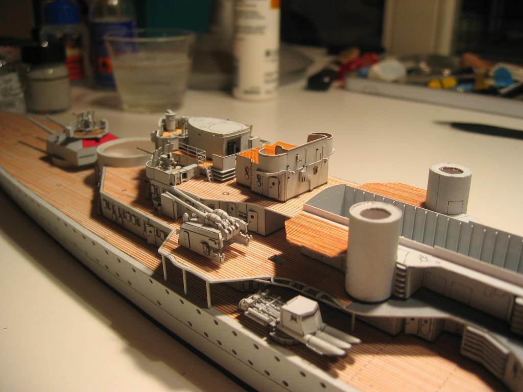 Dieses Hinzufügen winzigster Details nennt man im Modellbau „Supern“, und nur wenige bringen es darin zur selben Könnerschaft wie der 47-jährige Thalwiler. Aus technischen Archiven beschafft sich Grüninger die Planzeichnungen der Prinz Eugen und konstruiert auf ihrer Basis eigene Modellbaubögen, die er am Computer verkleinert. Dass bei diesem Präzisionsfuror sein Schiff nicht schneller wächst als ein menschliches Haar, kümmert Mister Mikro nicht. Im Gegenteil: Als er auf alten Aufnahmen entdeckte, dass an den Innenwänden der Umzäunungen der Decksmaschinerie die unteren Kanten schwarz bemalt waren, verlegte er nachträglich einen schmalen schwarzen Papierstreifen. „Das erforderte schon etwas Nerven“, meint Grüninger. „Aber als Privatschullehrer für Jugendliche mit Lernschwierigkeiten hat man die, glauben Sie mir.“